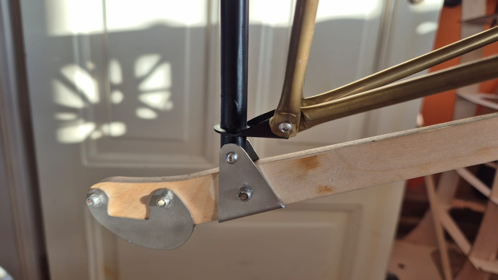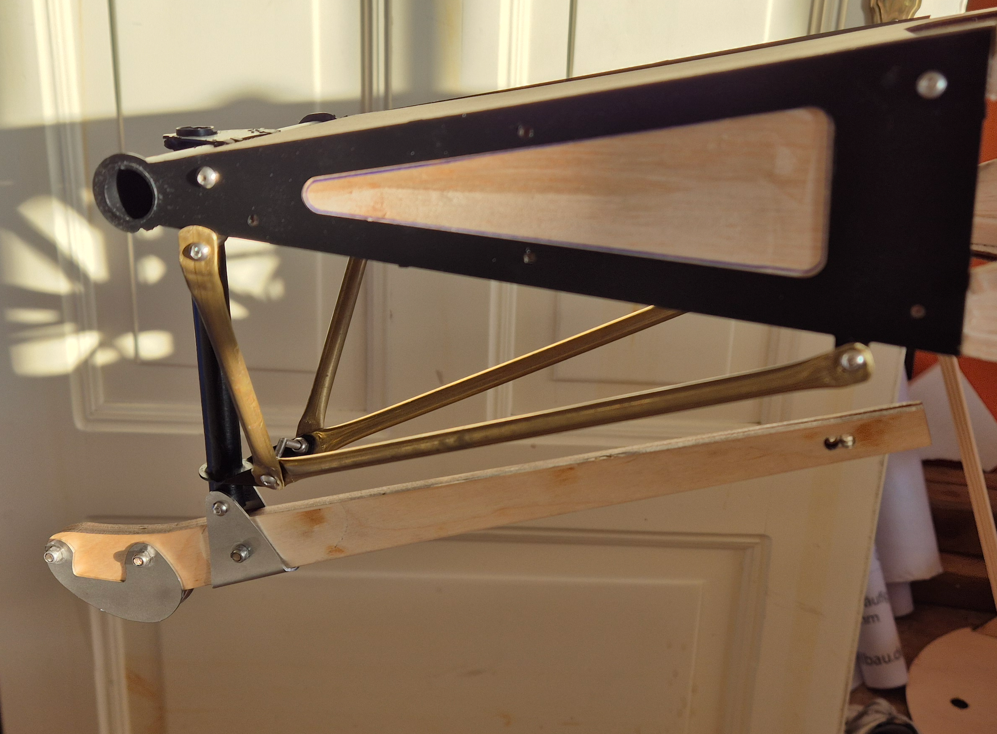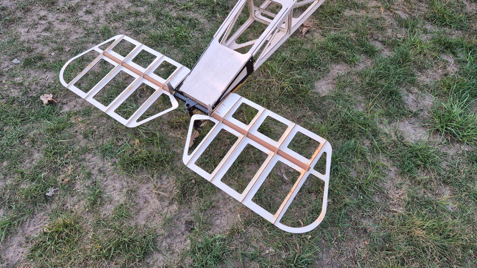 The fuselage, wings, and tail are made of wood. The landing gear, the dome for the bracing, and the linkage parts for the tail are made of stainless steel.