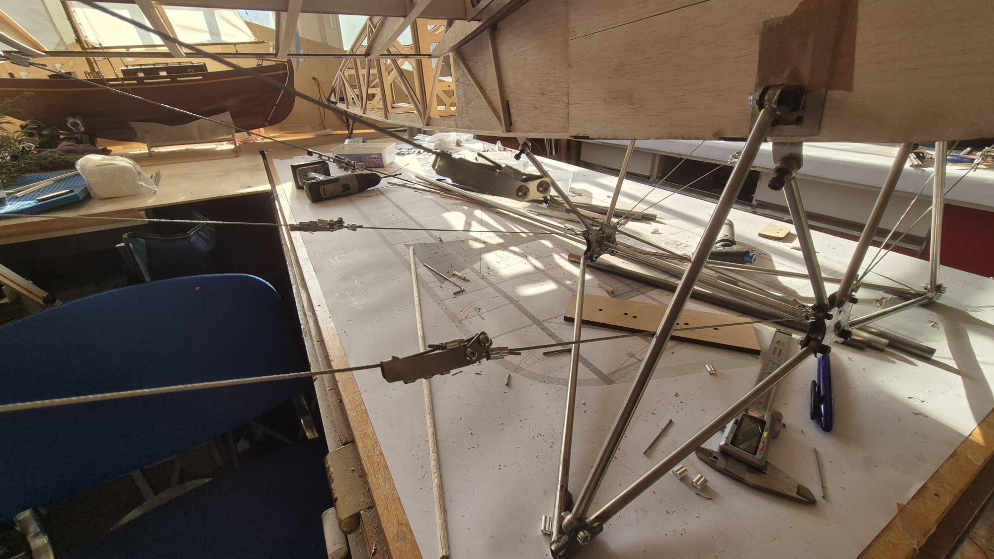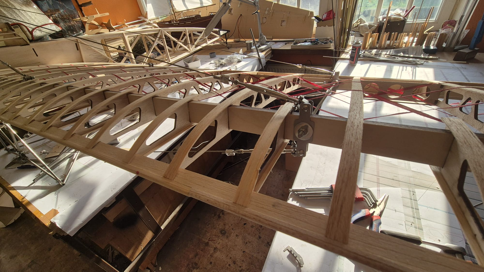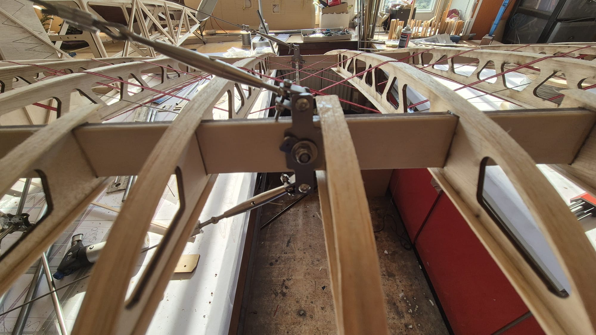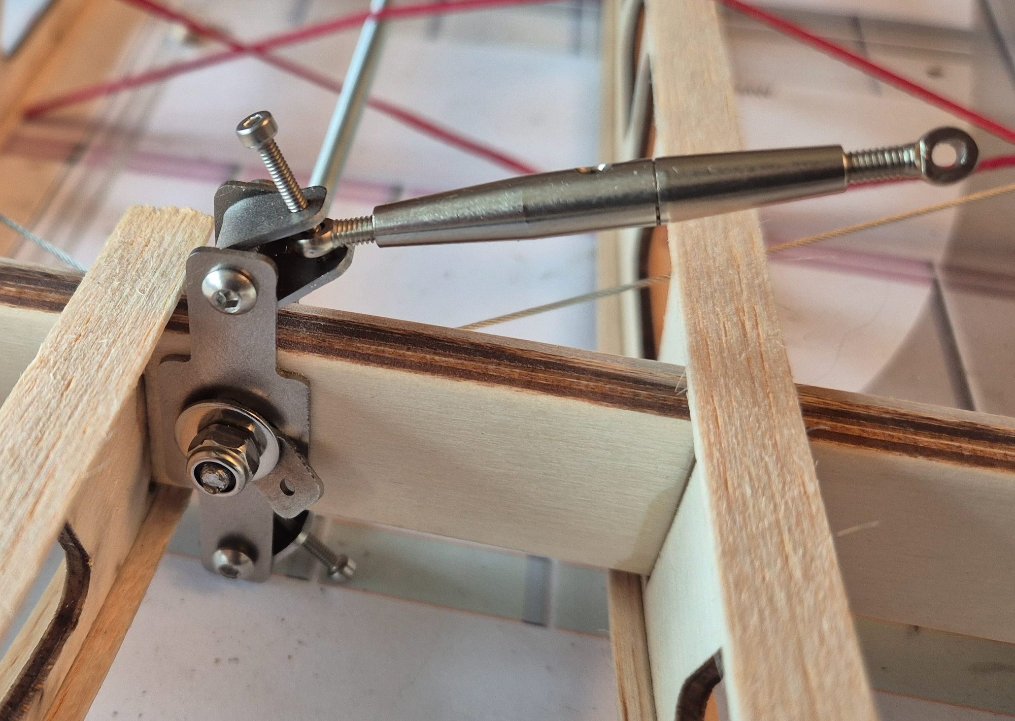 If you want to build the model without ailerons, the kit includes extra ribs to replace the ailerons. Our tension tower has two pulleys that allow the rear upper cables of the wing to run freely, enabling warping. The warping control is outlined in the plan but requires some work on your part.